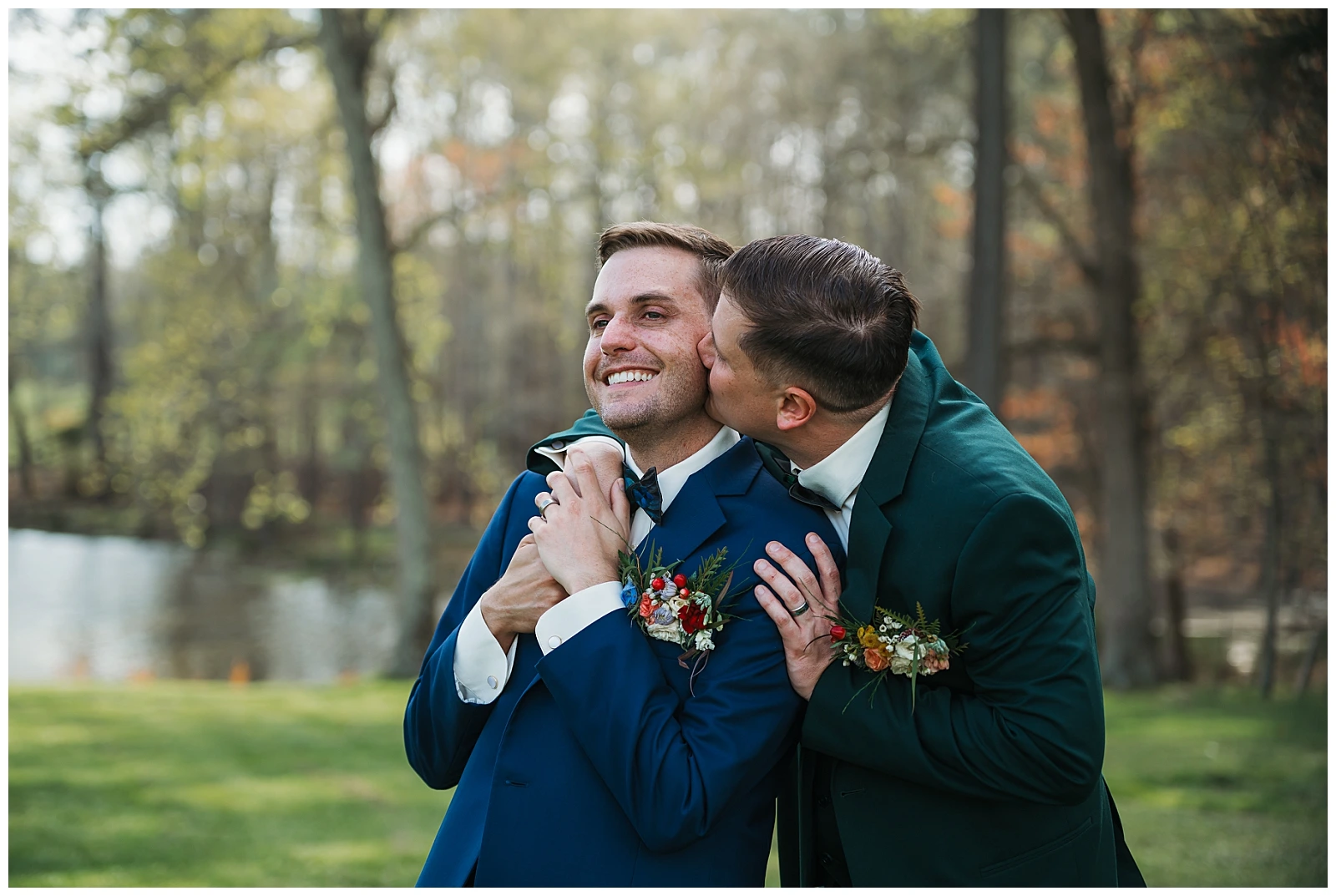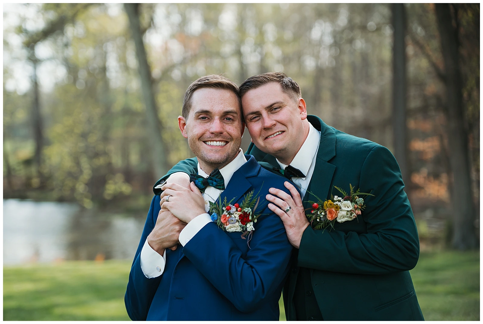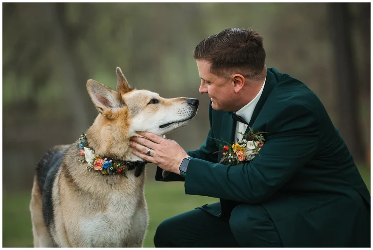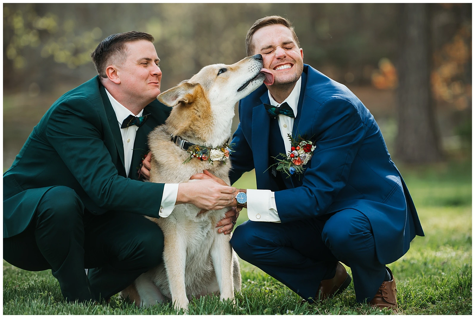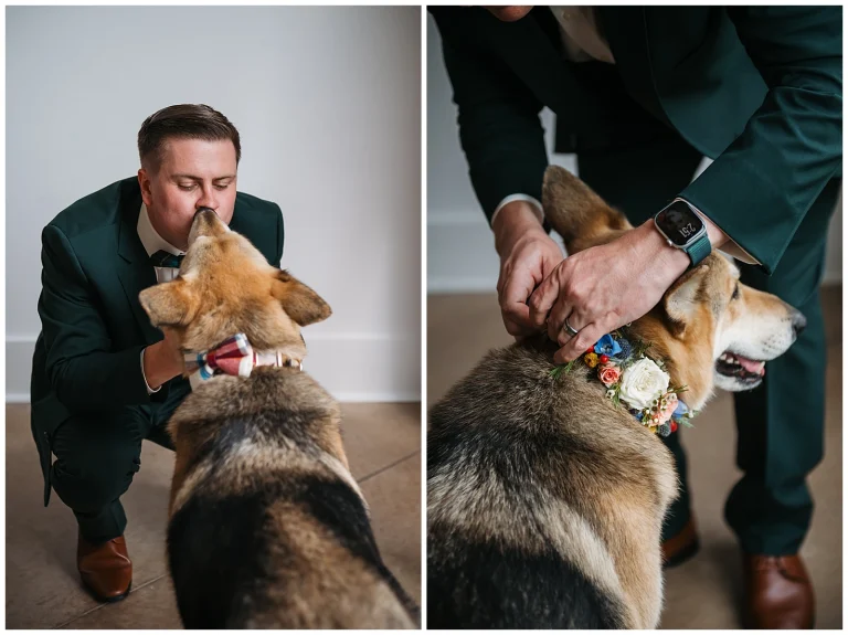 Set against the timeless charm of Oakdale, the couple chose a classic color palette of emerald green and navy blue. The rich tones felt elegant yet welcoming, perfectly reflecting Adam and Shane’s style refined, heartfelt, and deeply personal. As a pet friendly wedding, Oakdale allowed one very important guest to steal the show early on: their beloved dog, Otis.