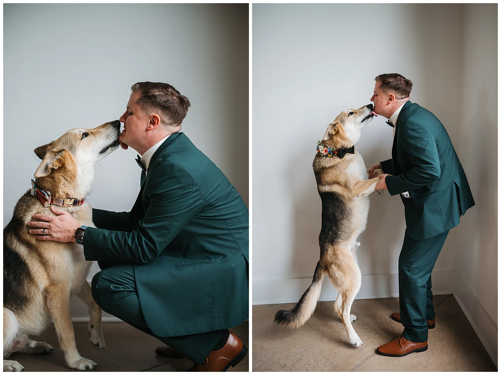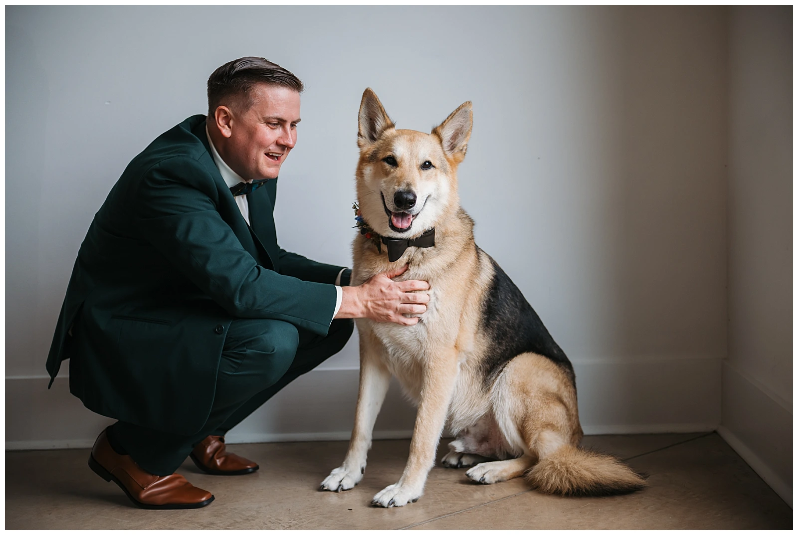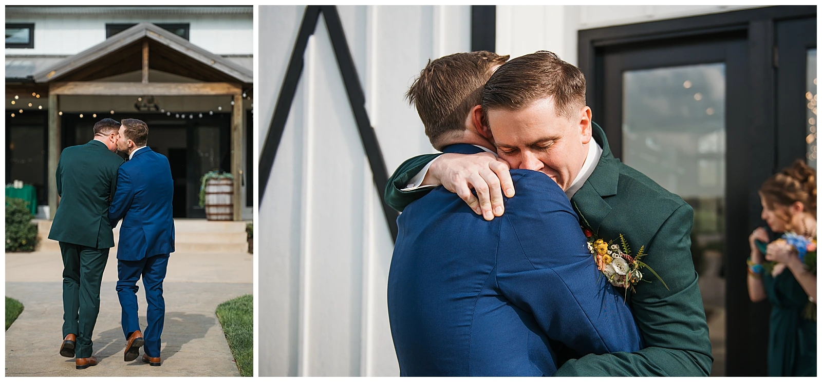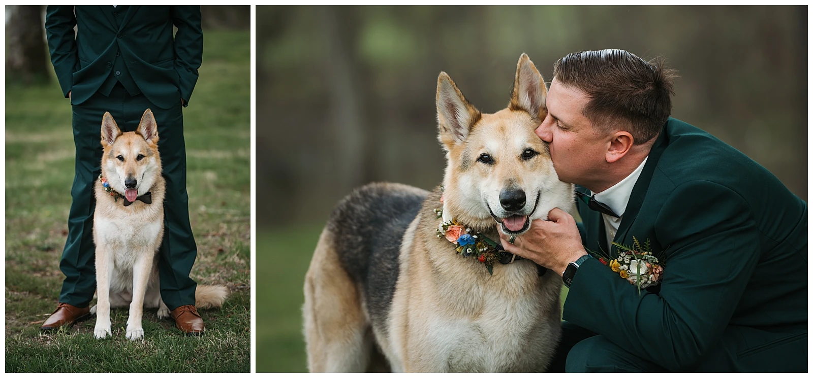 Set against the timeless charm of Oakdale, the couple chose a classic color palette of emerald green and navy blue. The rich tones felt elegant yet welcoming, perfectly reflecting Adam and Shane’s style refined, heartfelt, and deeply personal. As a pet friendly wedding, Oakdale allowed one very important guest to steal the show early on: their beloved dog, Otis.