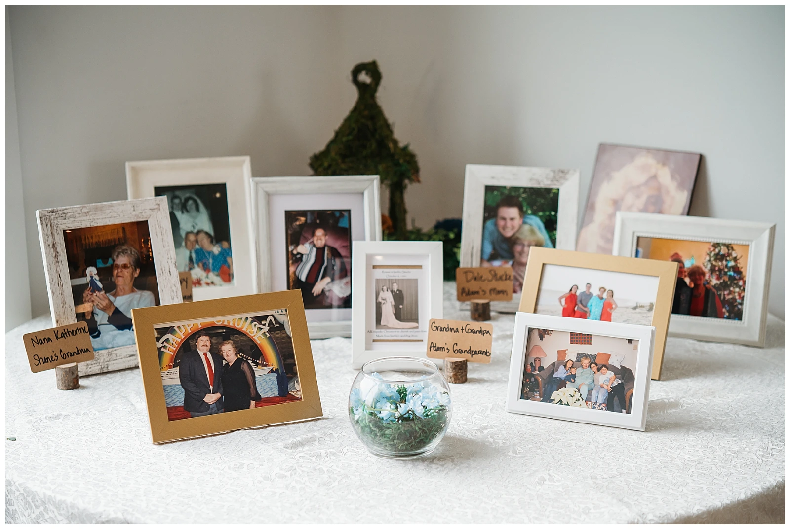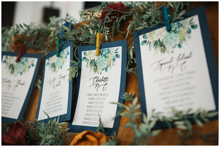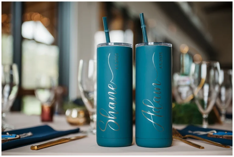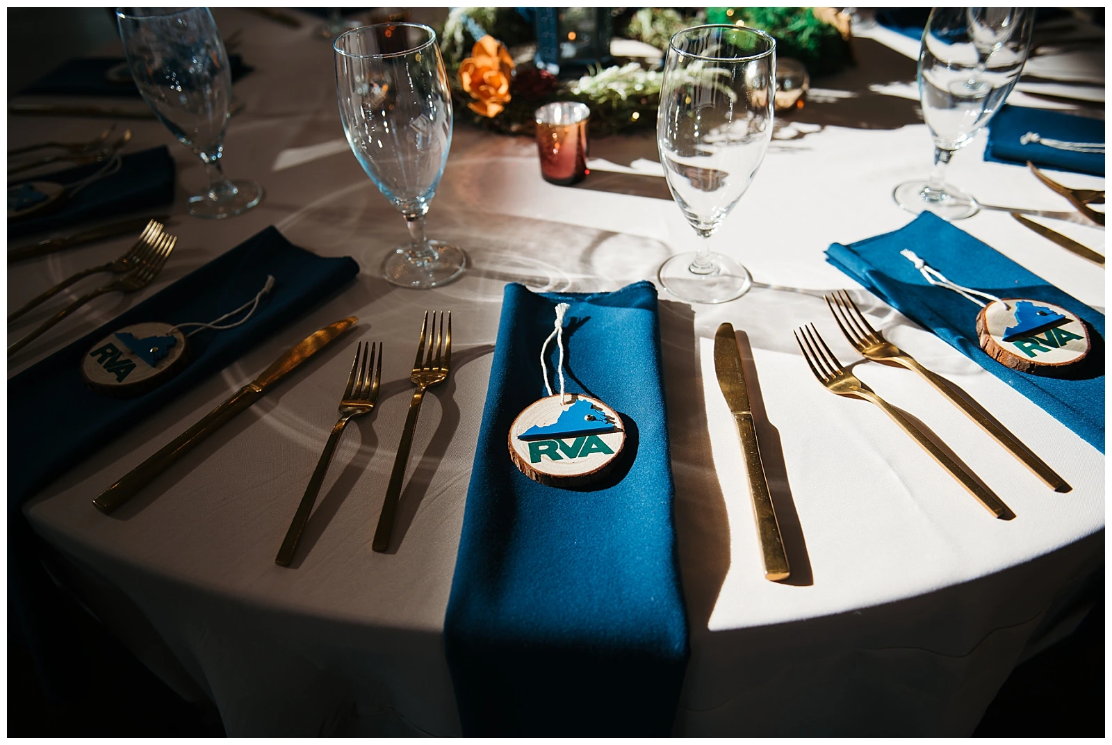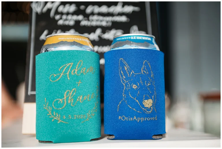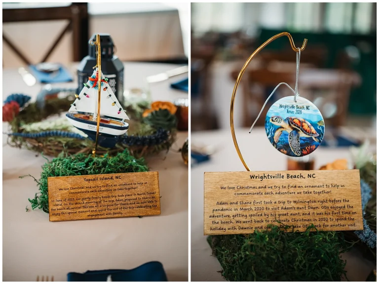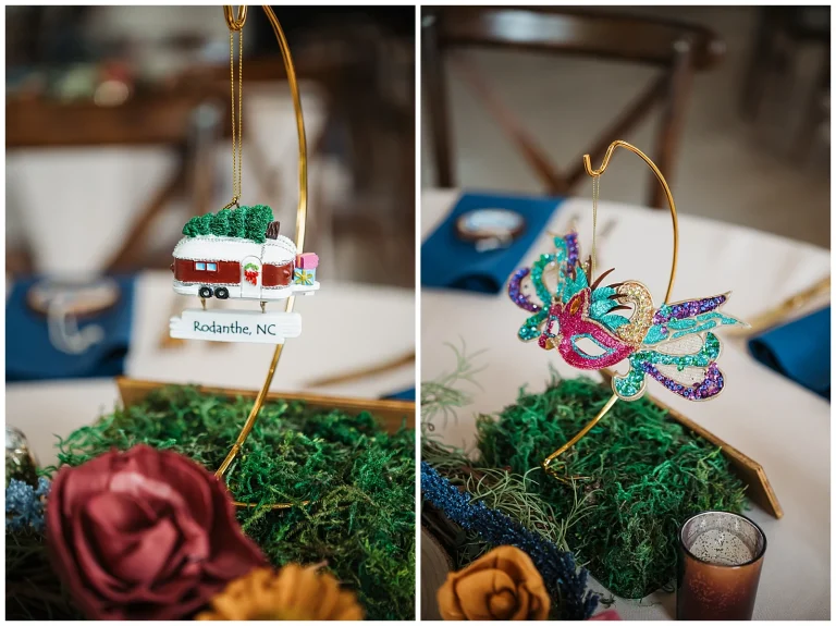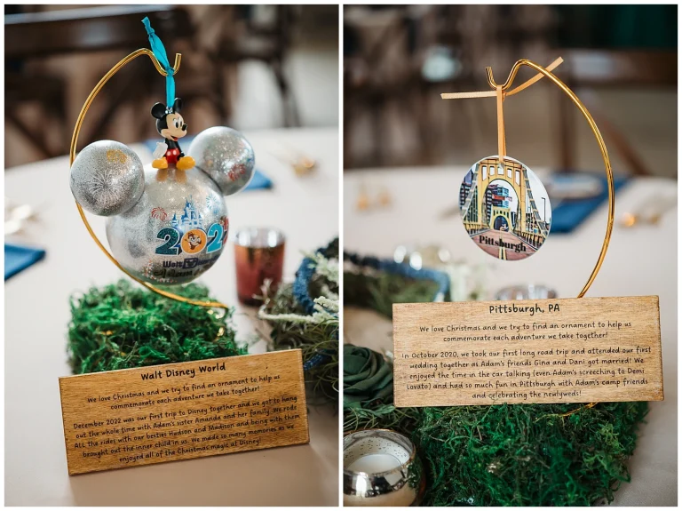 The reception continued the theme of meaningful details. Each table featured special Christmas ornaments displayed alongside handcrafted wooden plaques explaining the significance of the trips where the ornaments were collected. It was such a thoughtful way to share their story with guests. At every place setting, attendees found a handcrafted RVA ornament made by Adam and Shane themselves, a heartfelt keepsake and a personal thank-you to everyone who helped create their safe, loving community.