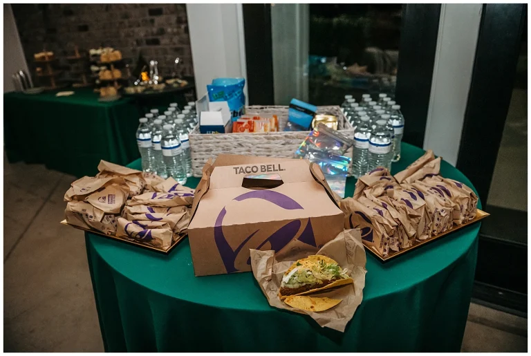 As the night went on, the party energy ramped up in the best way. A “make your own hangover kit” station had guests laughing and planning ahead, stocked with Advil, aspirin, Liquid IV packets, and Pepto-Bismol. It was equal parts practical and hilarious. And just when everyone thought the night couldn’t get better, late-night Taco Bell arrived. The crowd absolutely lost it. Proof that nothing brings people together quite like tacos at the end of a perfect night.