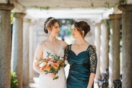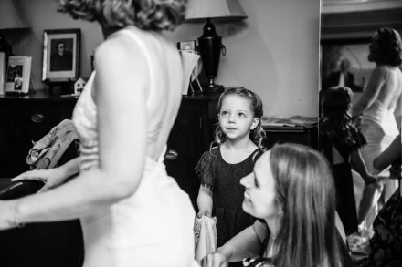 Mother of the bride helps daughter get dressed at Dover Hall